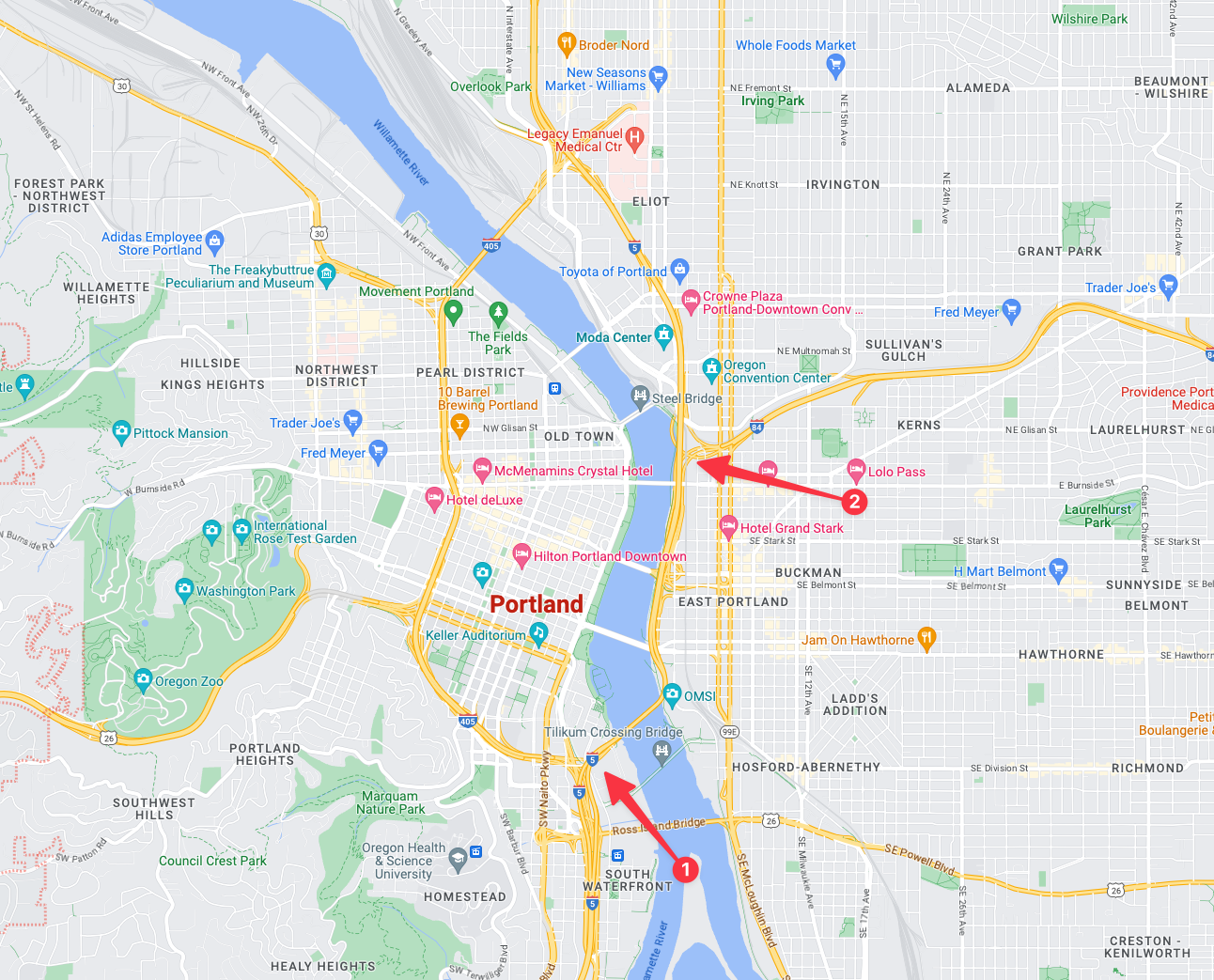 I’d love to see I-5 just ripped out between point 1 and 2 on the map. It’d be easy to do and the capacity issues with the two merges at that point would be removed too, it’d just become seamless turns and instead the state and feds responsible for I-5 could stop wasting Portland’s time and money and instead focus on the other connection point of I-84 and I-5 that has, would, and continues to this day to exist in north Portland.
